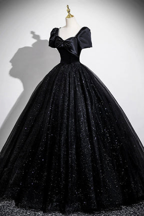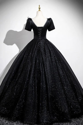 Black Satin and Shiny Tulle Long Prom Dress, Black A-Line Short Sleeve Party Dress