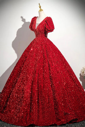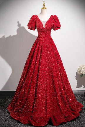 Red V-Neck Sequins Long Prom Dress, A-Line Short Sleeve Party Dress