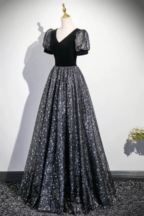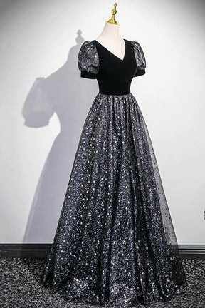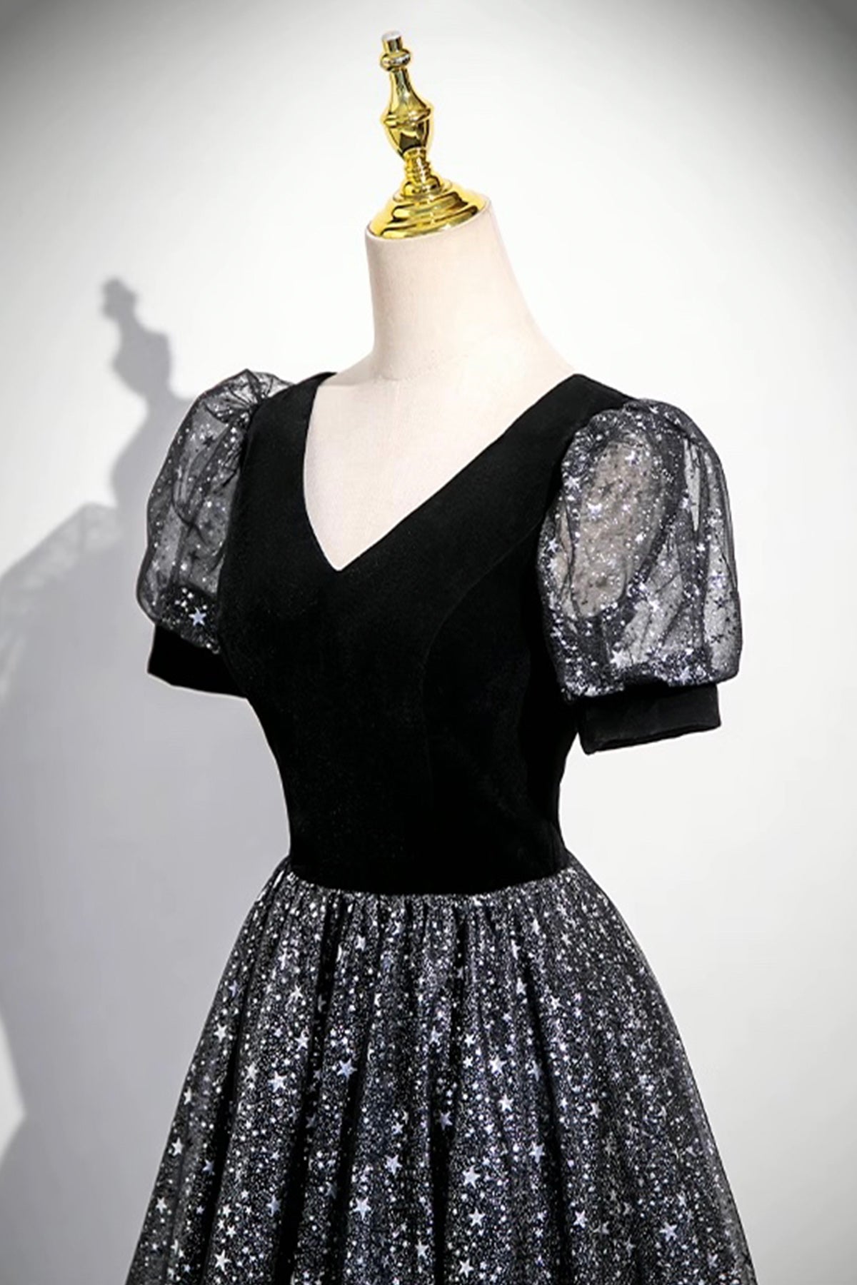 Black V-Neck Velvet Tulle Long Prom Dress, A-Line Short Sleeve Evening Dress