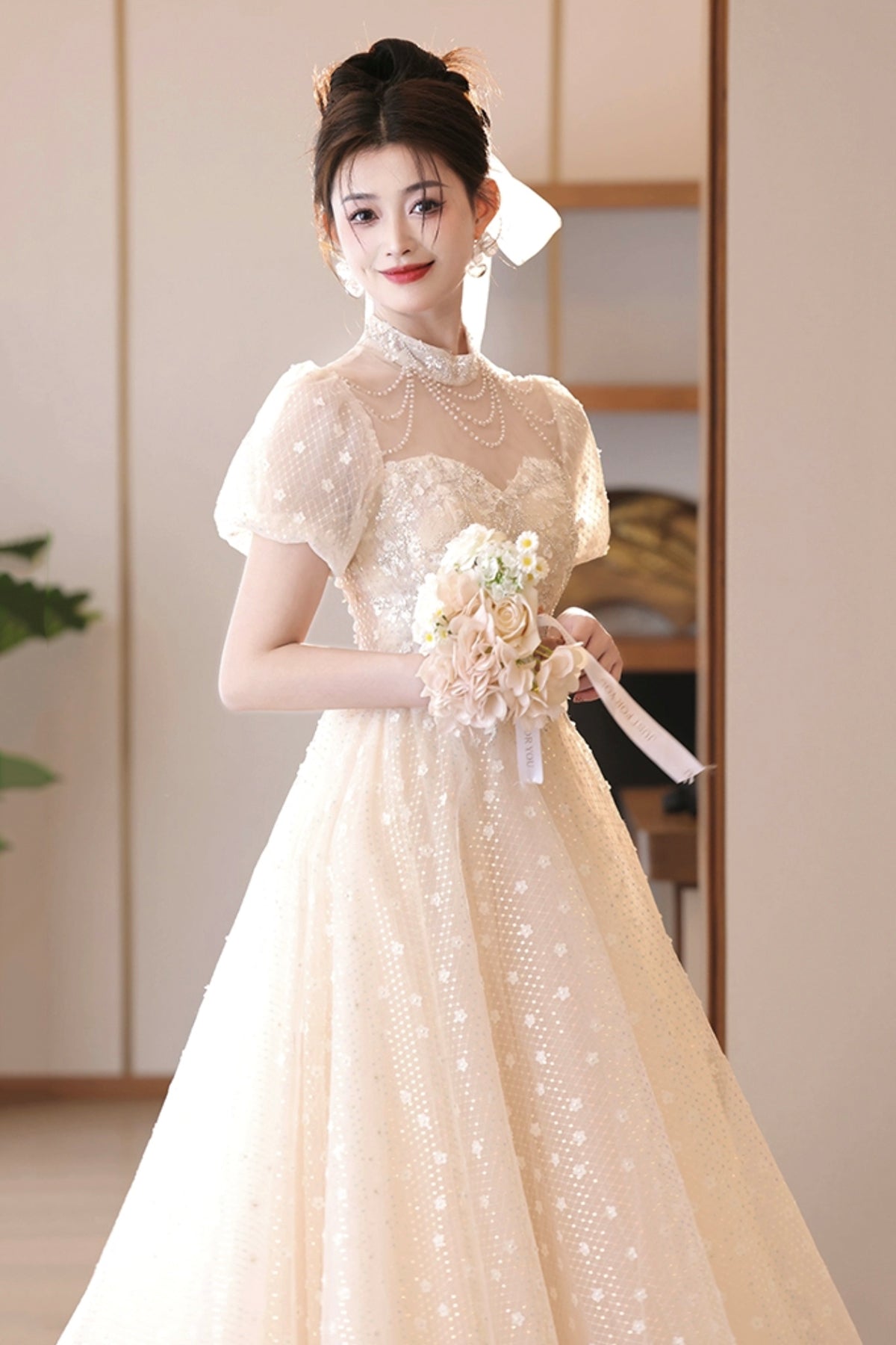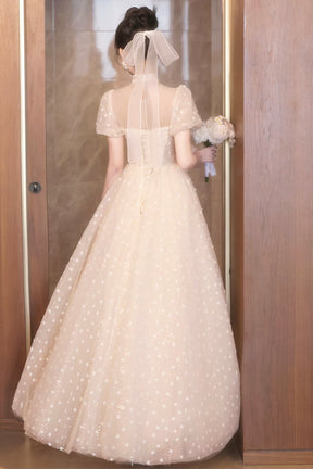 Champagne Tulle Sequins Long Prom Dress, A-Line Short Sleeve Evening Party Dress